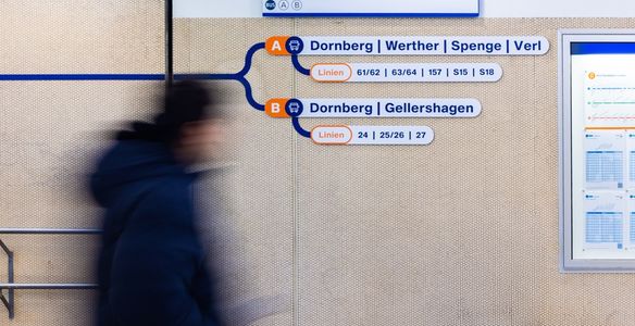 Auf der Verteilerebene rund um das ServiceCenter moBiel am Jahnplatz wird aktuell eine umfangreiche Beschilderung installiert, um unseren Fahrgästen, die nicht jeden Tag den ÖPNV nutzen, den Umstieg von der StadtBahn zum Bus zu erleichtern.
