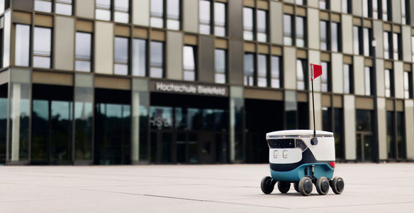 Klappe auf, Einkauf rein: Vier Lastenroboter transportieren aktuell Güter für Bewohner:innen des Bielefelder Lohmannshof auf der „letzten Meile“ von einem Parkplatz bis zur Haustür.