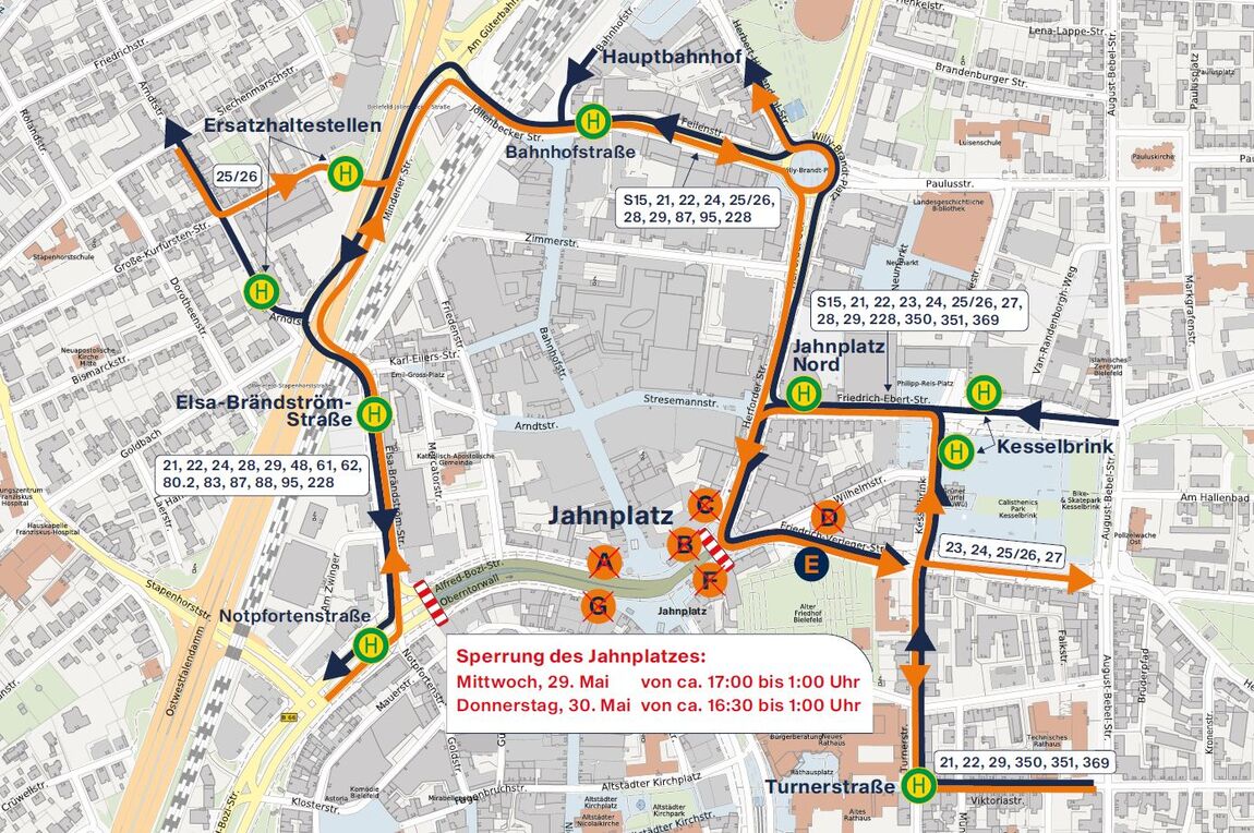 - Jahnplatz-Sperrung ab 16:30 Uhr: Die Bus-Linien werden von 16:30 bis 1:00 Uhr umgeleitet und fahren in dieser Zeit umliegende Haltestellen an.