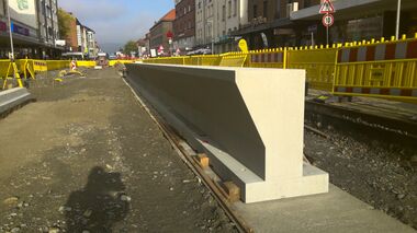 Im Oktober 2023 nimmt der neue Hochbahnsteig »Normannenstraße« langsam Gestalt an: Das Fundament ist bereits gegossen, die Betonfertigteile werden nach und nach positioniert. Liegen wird die neue Haltestelle auf der Höhe von Rossmann und dm. Die anderen beiden Bahnsteige »Gaswerkstraße« und »Brackwede Kirche« folgen.