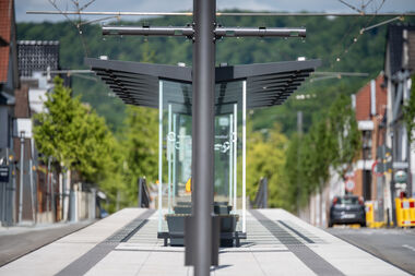 Die Arbeiten befinden sich auf der Zielgeraden. Die modernen Hochbahnsteige und Haltestellen fügen sich harmonisch in das neue Straßenbild ein.