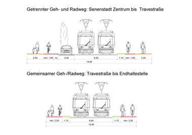 Somit ist in der Elbeallee auf beiden Seiten ein getrennter Geh- und Radweg bis zur Travestraße bzw. südlich Am Stadion geplant. Zwischen der Travestraße und dem Senner Hellweg ist die Elbeallee schmaler. Um Grunderwerb zu minimieren, wird hier eine gemischte Führung des Geh-/Radweges favorisiert. Auch wenn so platzsparend wie nötig geplant wird, sind laut aktuellem Stand zirka zehn Grundstücke betroffen.