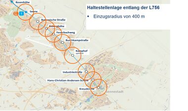 Die Standortwahl für die Haltestellen richtet sich vor allem nach der baulichen Machbarkeit von Hochbahnsteigen. Weitere Kriterien sind die Fußwege in die Wohngebiete, zu Arbeitsstätten und zu zentralen Einkaufsmöglichkeiten. Momentan sind in der Planung entlang der L756 folgende Haltestellen berücksichtigt: