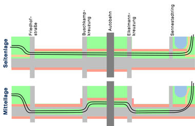 Die StadtBahn-Trasse liegt von der Rosenhöhe kommend bereits in nördlicher Lage. In Sennestadt könnte die Trasse nach Norden in die Elbeallee abbiegen. Vorgabe war es, dass die StadtBahn unabhängig von der Autobahn in der nördlichen Lage geführt wird. Somit wird die Trasse insgesamt in nördlicher Lage geführt, sodass die StadtBahn unabhängiger vom übrigen Verkehr ist und die Fahrbahnen der Brackweder Straße und Paderborner Straße nicht kreuzen muss. Würde sie in Mittellage geführt, müsste sie die L756 insgesamt vier mal queren, sodass die Kreuzungen im Schnitt alle 5 Minuten für den restlichen Verkehr komplett gesperrt werden müssten. Die Leistungsfähigkeit der L756 wäre damit stark eingeschränkt. Der Platzbedarf im Verkehrsraum ist in den Varianten Seitenlage und Mittellage ähnlich groß.