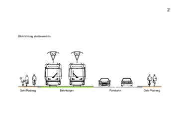 Die Hochbahnsteige entlang der L756 werden voraussichtlich als Seitenbahnsteige, rechts und links der StadtBahn-Trasse umgesetzt werden. Seitenbahnsteige beanspruchen nämlich bei einer Stadtbahntrasse in Seitenlage weniger Querschnittsbreite.