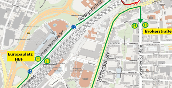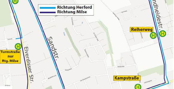 Bis auf Weiteres werden die Bus-Linien 64, 87, 95, N3 und N8 aufgrund einer Einbahnstraßenregelung in der Herforder Straße und der Sperrung der Kavalleriestraße umgeleitet.