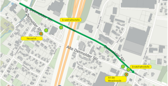 Ab Freitag, 19. Dezember bis Sonntag 4. Januar 2026 pausieren die Bauarbeiten an der Alten Detmolder Straße. In diesem Zeitraum wird die Umleitung aufgehoben und der reguläre Linienweg gefahren!