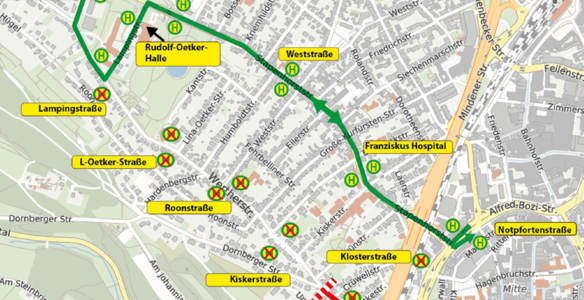 Von Montag, 1. Dezember bis vsl. 2. April 2026 werden die Bus-Linien 32, 38, 127, 131, 138 und N5 an der Alten Detmolder Straße umgeleitet.