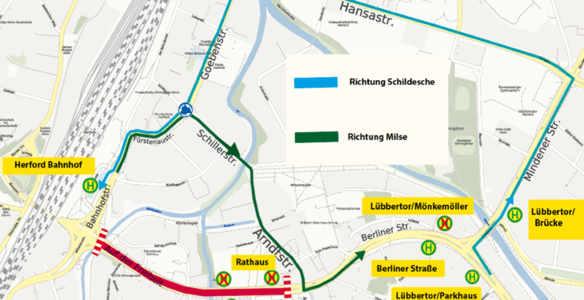 Von Montag, 16. Februar bis vsl. 10. April werden die Bus-Linien 64, 87, 95, 126 und 369 sowie die NachtBusse N3 und N8 an der Herforder Straße umgeleitet.