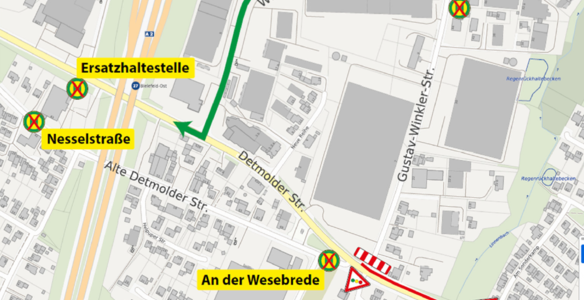 Von Montag, 1. Dezember bis vsl. 1. Mai 2026 werden die Bus-Linien 32, 38, 127, 131, 138 und N5 an der Alten Detmolder Straße umgeleitet.