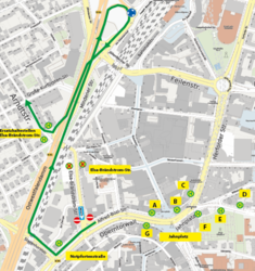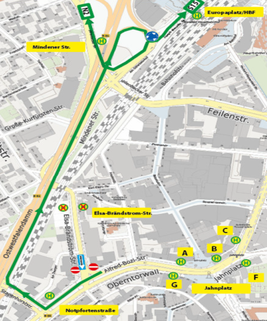- Alternativen in Richtung Hbf/Europaplatz: (H) Notpfortenstraße oder (H) Jahnplatz