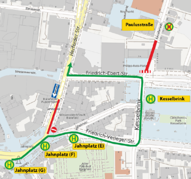 Bis auf Weiteres werden die Bus-Linien 64, 87, 95, N3 und N8 aufgrund einer Einbahnstraßenregelung in der Herforder Straße und der Sperrung der Kavalleriestraße umgeleitet.