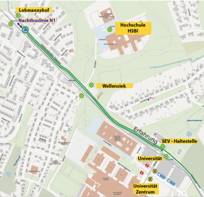 - Richtung Lohmannshof: SEV-Haltestelle unter der Fußgängerbrücke