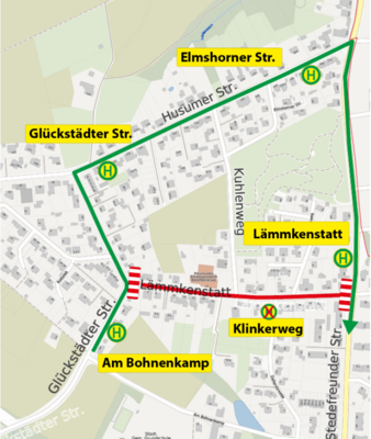 - (H) Elmshorner Straße, (H) Glückstädter Straße und (H) Lämmkenstatt (Linie 30)