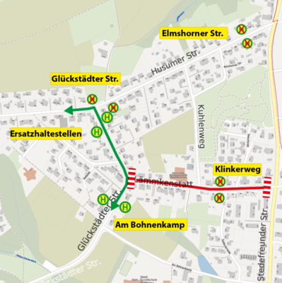 - Ersatzhaltestellen in der Glückstädter Straße (Linien 51 und 151)
