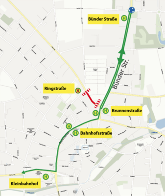 Die Umleitung verläuft über Bünder Straße, Bahnhofstraße und Spenger Straße. Alle Haltestellen auf der Strecke werden mit bedient.