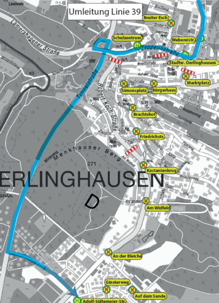 Von 12:00 Uhr bis voraussichtlich 14:30 Uhr wird die Bus-Linie 39 in beide Richtungen an der Hauptstraße umgeleitet.