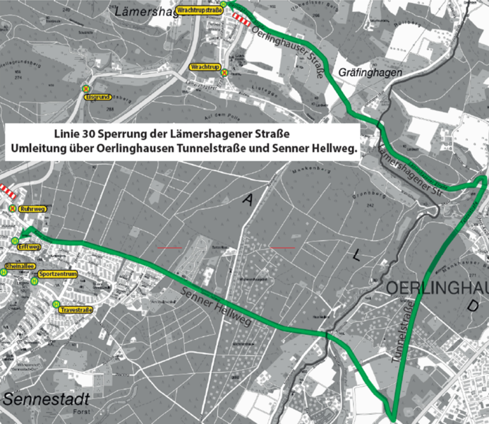 Die Umleitung erfolgt über Senner Hellweg und Tunnelstraße.