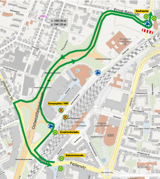 - Ersatzhaltestelle in der Str. am Güterbahnhof (in Richtung Spenge)
