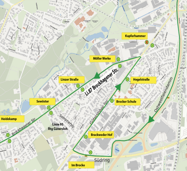 In Richtung Gütersloh fährt die Linie 87 über den Ostwestfalendamm bis zur Abfahrt IKEA, über Südring, Gütersloher Straße und Brockhagener Straße.