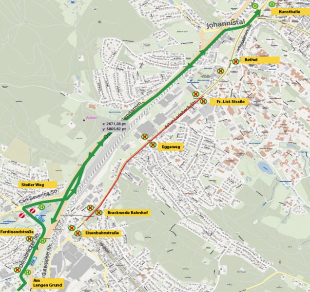 Die Umleitungsstrecke verläuft in Richtung Bielefeld über die Osnabrücker Straße, dem Ostwestfalendamm bis zur Auf-/Abfahrt Johannistal und über die Artur-Ladebeck Straße.