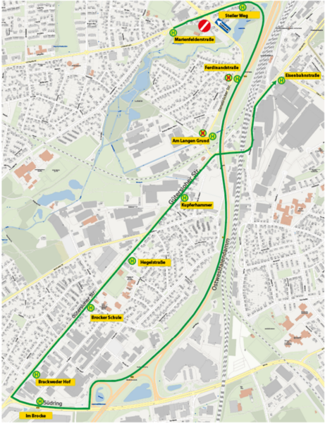 Auf der Umleitungsstrecke über die Gütersloher Straße werden alle Haltestellen bedient (siehe Skizze).