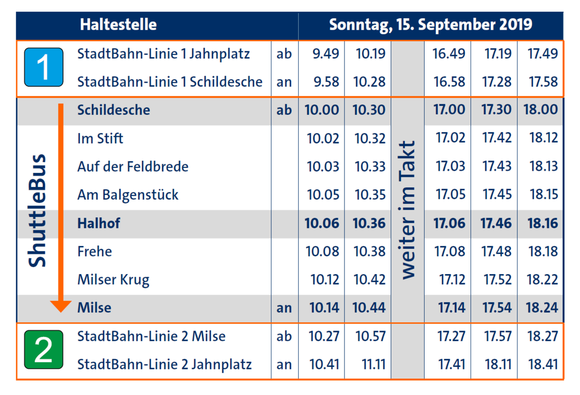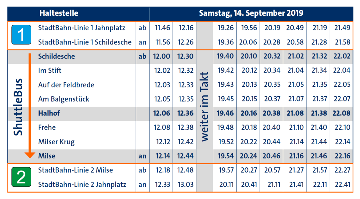 Die Busse starten an der StadtBahn-Haltestelle Schildesche und fahren bis zum Halhof. Von dort geht es weiter bis zur StadtBahn-Haltestelle Milse.