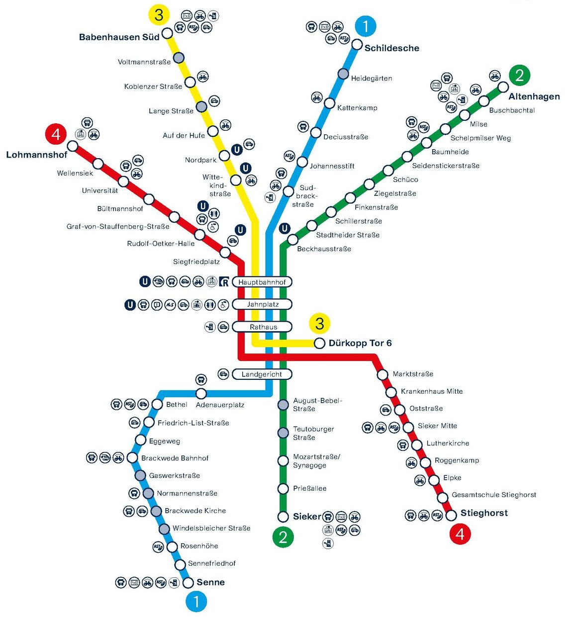 - Fahrgäste aus Babenhausen kommend müssen für eine Weiterfahrt in Richtung Stieghorst am Hauptbahnhof, Jahnplatz oder Rathaus in die Linie 4 umsteigen.