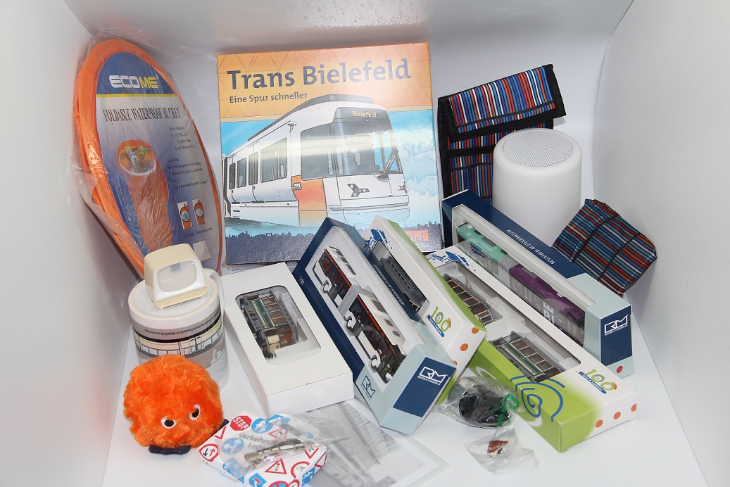 Diese und noch mehr Geschenke sind im Kundenzentrum Jahnplatz Nr. 5 oder online im moBiel Online-Shop erhältlich.