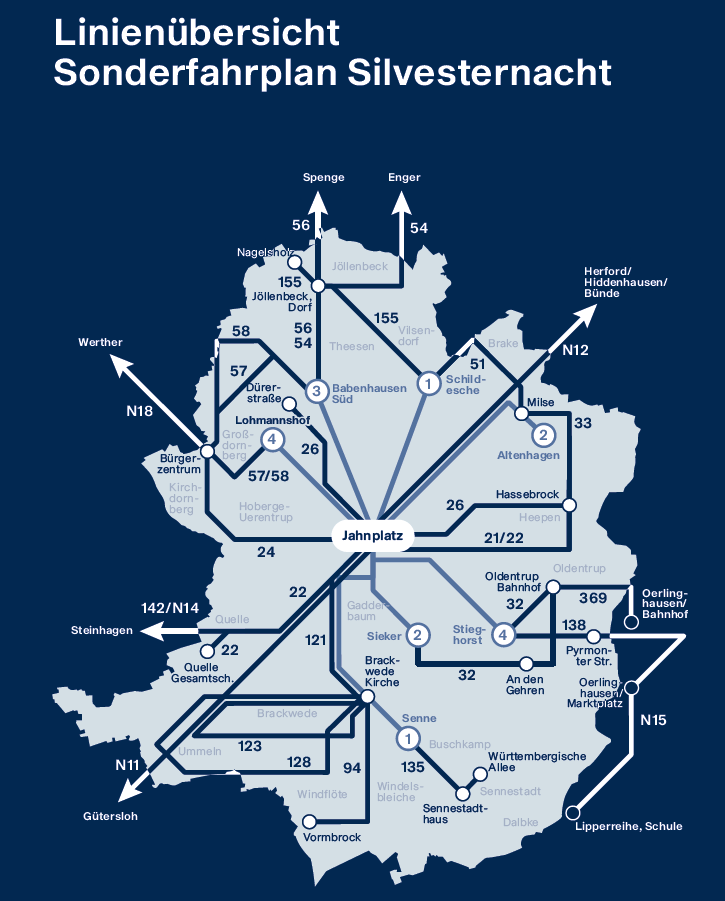 Die Broschüren mit allen Infos zu den Fahrtzeiten an Heiligabend und Silvester erhalten Sie ab Anfang Dezember im ServiceCenter moBiel oder im Jahnplatz Nr. 5