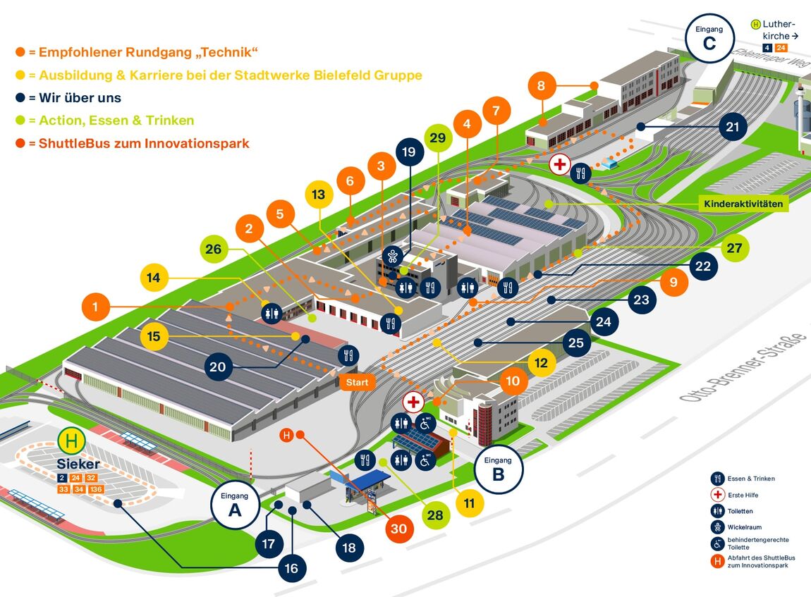 Zusätzlich gibt es im Verwaltungsgebäude (Station 19) zwei Vorträge zum Thema „Projektentwicklung Innovationspark & Wasserstoffbusse“ (12:00 und 15:30 Uhr).