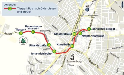 Der TierparkBus fährt im 30-Minuten-Takt zwischen den Haltestellen Jahnplatz und Tierpark.